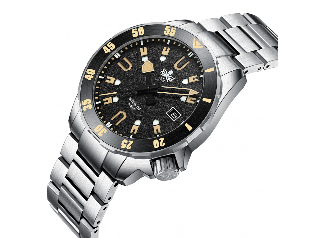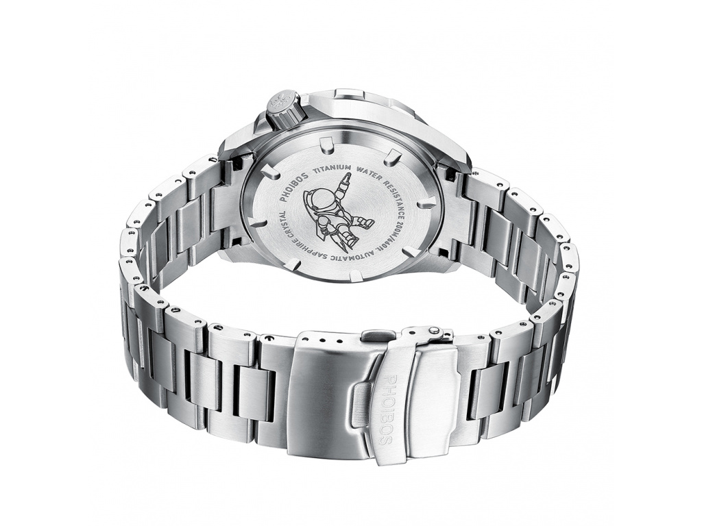Provedení hodinek PHOIBOS Diver je založené na masivním ocelovém tahu, řemínku s překlápěcí sponou a bezpečnostní páčkou na boku. Fenomenální design doplňuje klasické zobrazení času – centrální vteřinovka a datumovka na pozici 3. Jednoduše, ve vodě nebo na souši – při jakékoli aktivitě budete vypadat dobře.