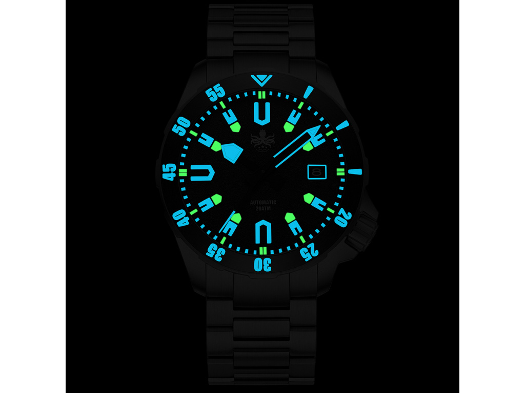 PHOIBOS Diver jsou neobyčejné potápěčské hodinky – ve vodě i mimo ni fungují perfektně. Můžete s nimi plavat, potápět se nebo provozovat jakékoli jiné vodní sporty. Mají voděodolnost 30 ATM (tzn. vydrží 300 m pod vodou) a překvapí vás mimořádnou luminiscencí Super-Luminova. Díky ní je čas jasně čitelný i při potápění v jeskyních nebo ve větších hloubkách.