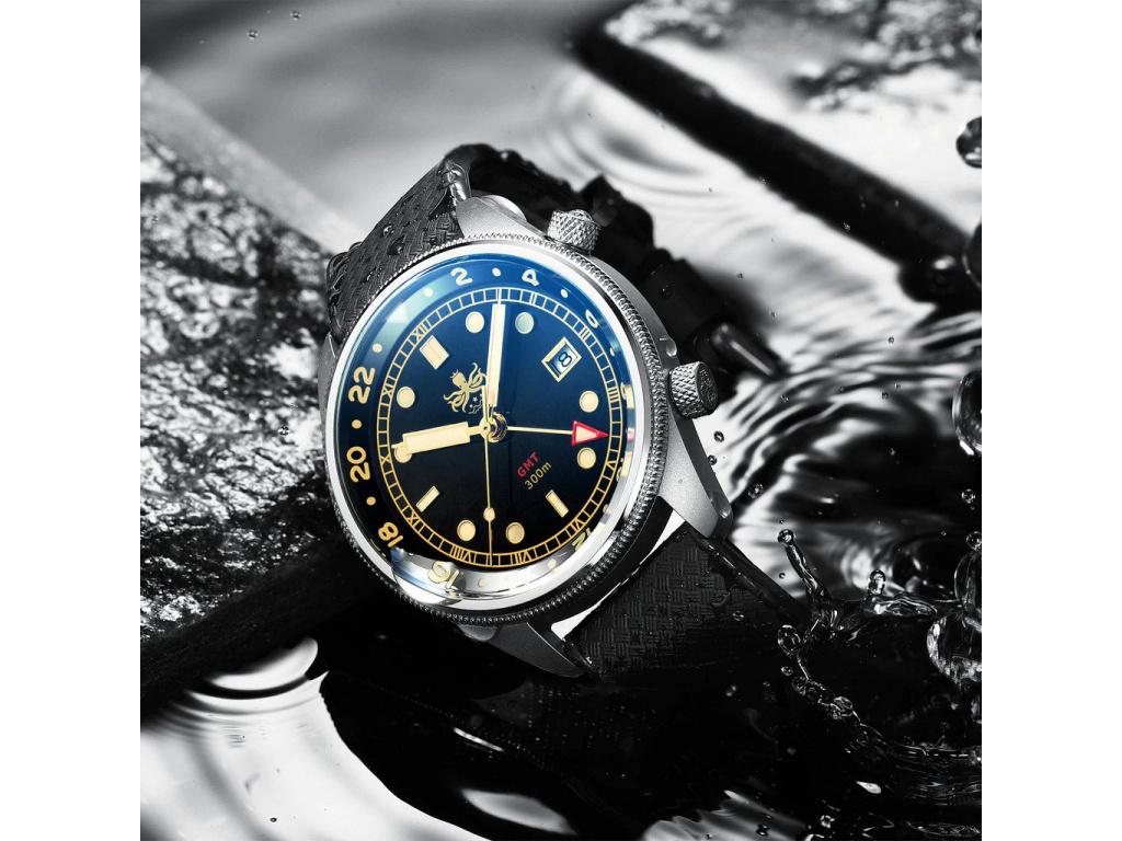 PHOIBOS Diver jsou neobyčejné potápěčské hodinky – ve vodě i mimo ni fungují perfektně. Můžete s nimi plavat, potápět se nebo provozovat jakékoli jiné vodní sporty. Mají voděodolnost 30 ATM (tzn. vydrží 300 m pod vodou) a překvapí vás mimořádnou luminiscencí Super-Luminova. Díky ní je čas jasně čitelný i při potápění v jeskyních nebo ve větších hloubkách.