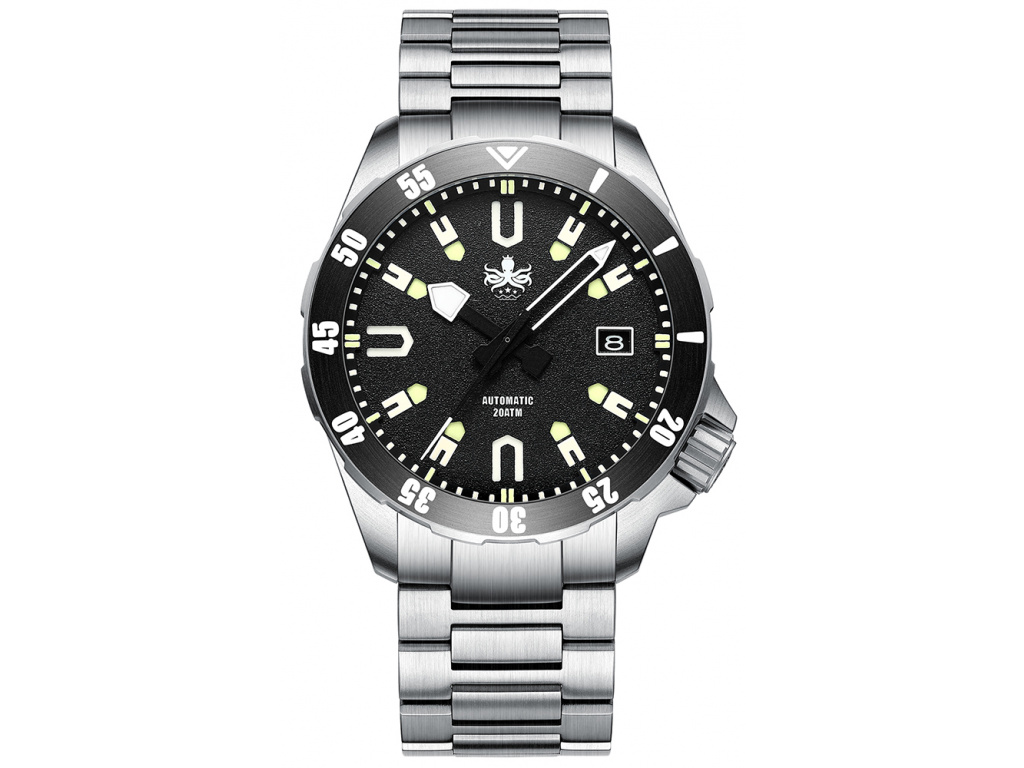 Provedení hodinek PHOIBOS Diver je založené na masivním ocelovém tahu, řemínku s překlápěcí sponou a bezpečnostní páčkou na boku. Fenomenální design doplňuje klasické zobrazení času – centrální vteřinovka a datumovka na pozici 3. Jednoduše, ve vodě nebo na souši – při jakékoli aktivitě budete vypadat dobře.