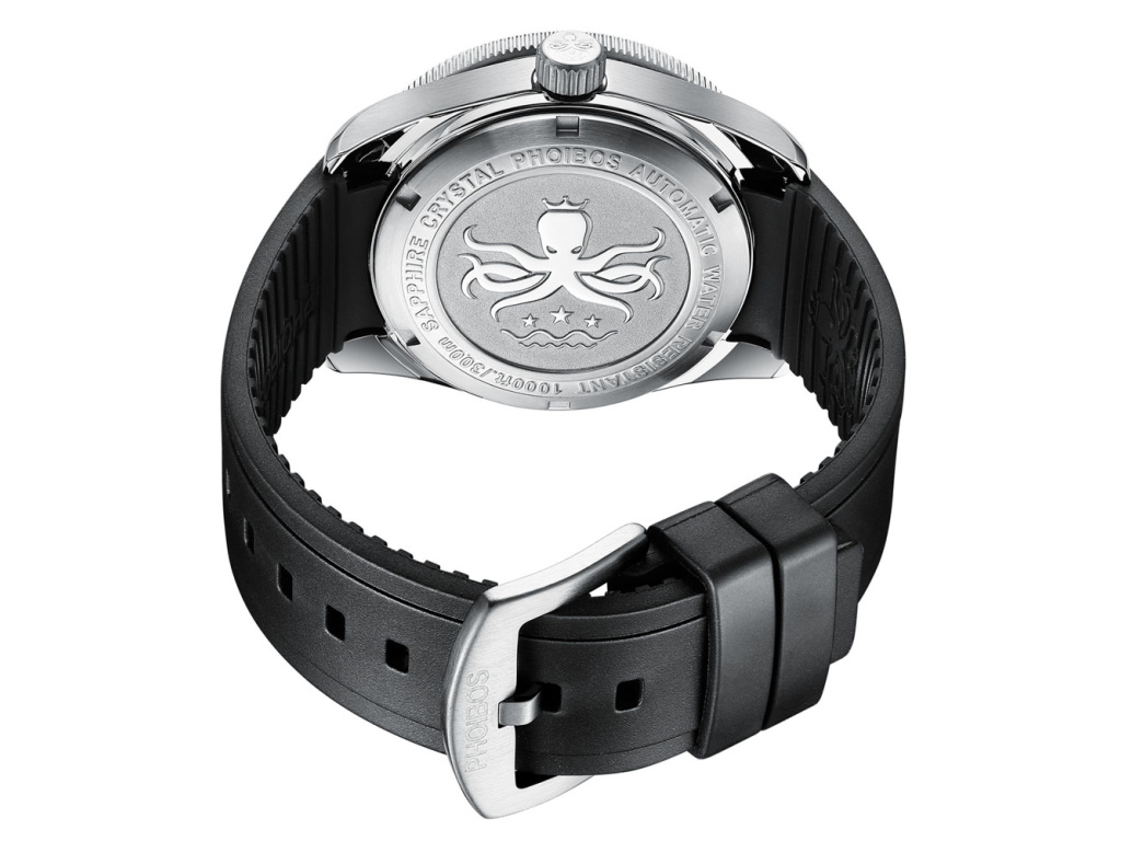 Provedení hodinek PHOIBOS Diver je založené na masivním ocelovém tahu, řemínku s překlápěcí sponou a bezpečnostní páčkou na boku. Fenomenální design doplňuje klasické zobrazení času – centrální vteřinovka a datumovka na pozici 3. Jednoduše, ve vodě nebo na souši – při jakékoli aktivitě budete vypadat dobře.