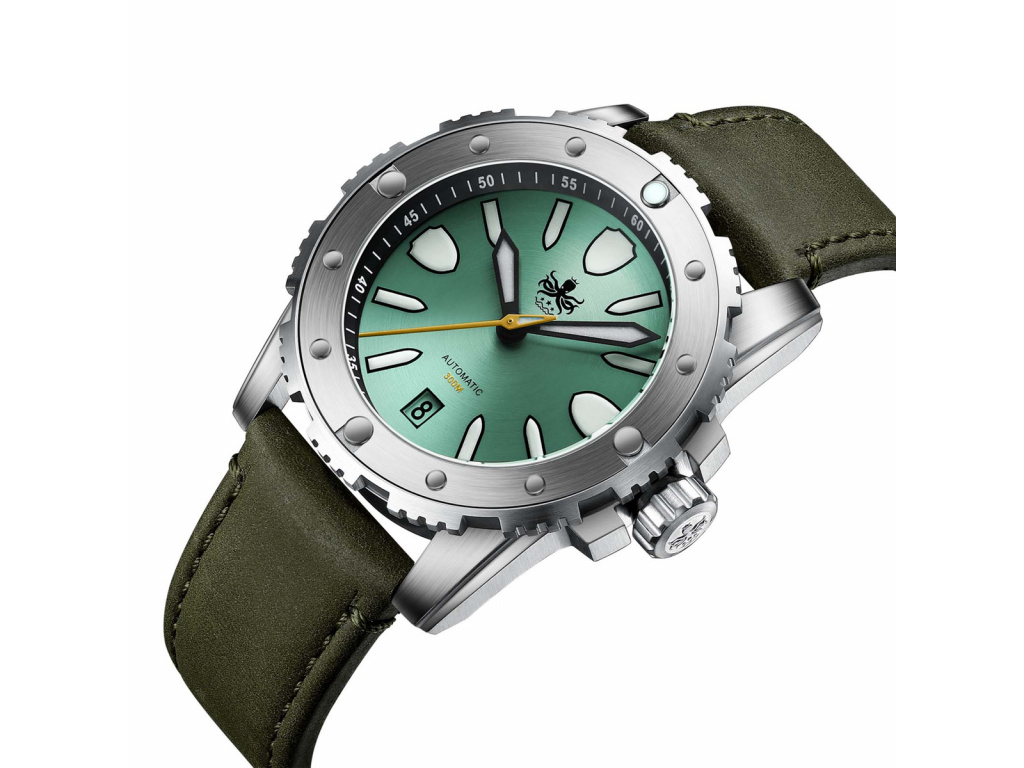 PHOIBOS Diver jsou neobyčejné potápěčské hodinky – ve vodě i mimo ni fungují perfektně. Můžete s nimi plavat, potápět se nebo provozovat jakékoli jiné vodní sporty. Mají voděodolnost 30 ATM (tzn. vydrží 300 m pod vodou) a překvapí vás mimořádnou luminiscencí Super-Luminova. Díky ní je čas jasně čitelný i při potápění v jeskyních nebo ve větších hloubkách.
