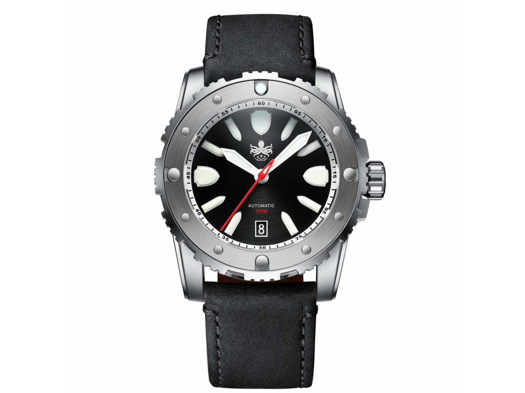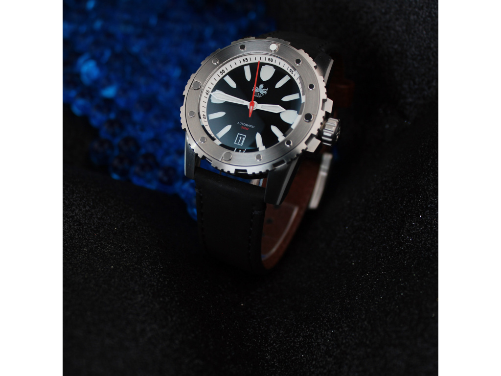 PHOIBOS Diver jsou neobyčejné potápěčské hodinky – ve vodě i mimo ni fungují perfektně. Můžete s nimi plavat, potápět se nebo provozovat jakékoli jiné vodní sporty. Mají voděodolnost 30 ATM (tzn. vydrží 300 m pod vodou) a překvapí vás mimořádnou luminiscencí Super-Luminova. Díky ní je čas jasně čitelný i při potápění v jeskyních nebo ve větších hloubkách.
