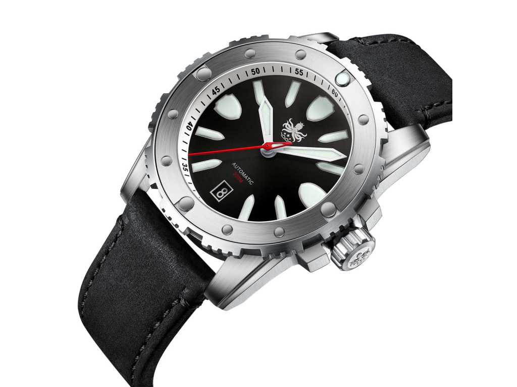 Provedení hodinek PHOIBOS Diver je založené na masivním ocelovém tahu, řemínku s překlápěcí sponou a bezpečnostní páčkou na boku. Fenomenální design doplňuje klasické zobrazení času – centrální vteřinovka a datumovka na pozici 3. Jednoduše, ve vodě nebo na souši – při jakékoli aktivitě budete vypadat dobře.