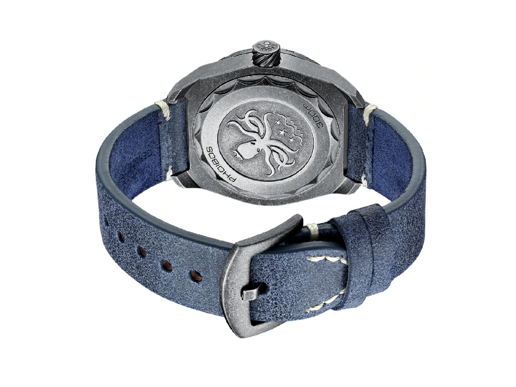 Provedení hodinek PHOIBOS Diver je založené na masivním ocelovém tahu, řemínku s překlápěcí sponou a bezpečnostní páčkou na boku. Fenomenální design doplňuje klasické zobrazení času – centrální vteřinovka a datumovka na pozici 3. Jednoduše, ve vodě nebo na souši – při jakékoli aktivitě budete vypadat dobře.