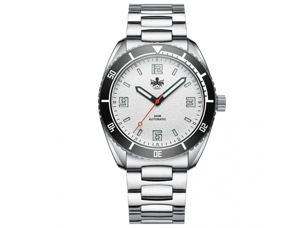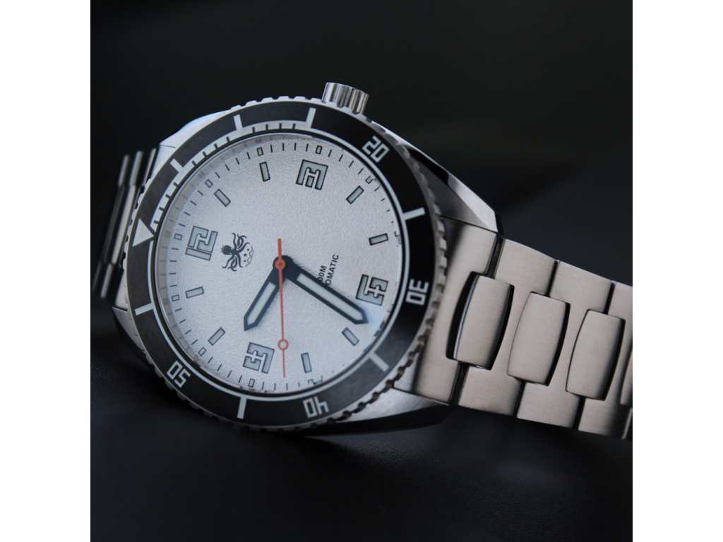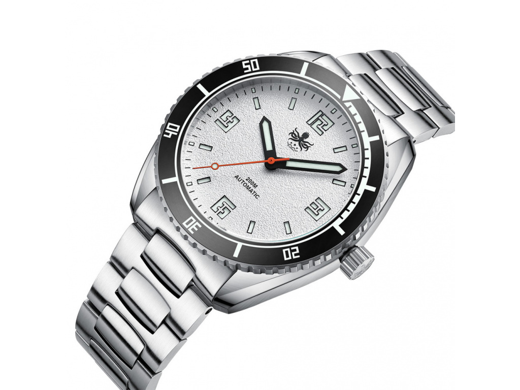 Provedení hodinek PHOIBOS Diver je založené na masivním ocelovém tahu, řemínku s překlápěcí sponou a bezpečnostní páčkou na boku. Fenomenální design doplňuje klasické zobrazení času – centrální vteřinovka a datumovka na pozici 3. Jednoduše, ve vodě nebo na souši – při jakékoli aktivitě budete vypadat dobře.
