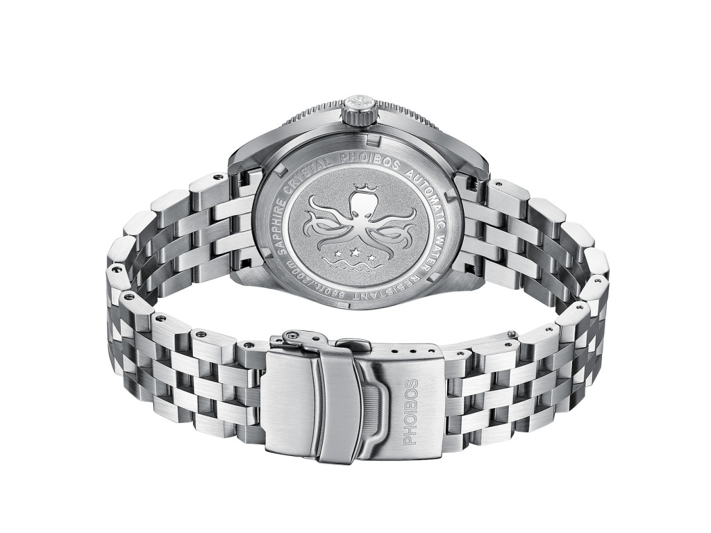 Provedení hodinek PHOIBOS Diver je založené na masivním ocelovém tahu, řemínku s překlápěcí sponou a bezpečnostní páčkou na boku. Fenomenální design doplňuje klasické zobrazení času – centrální vteřinovka a datumovka na pozici 3. Jednoduše, ve vodě nebo na souši – při jakékoli aktivitě budete vypadat dobře.
