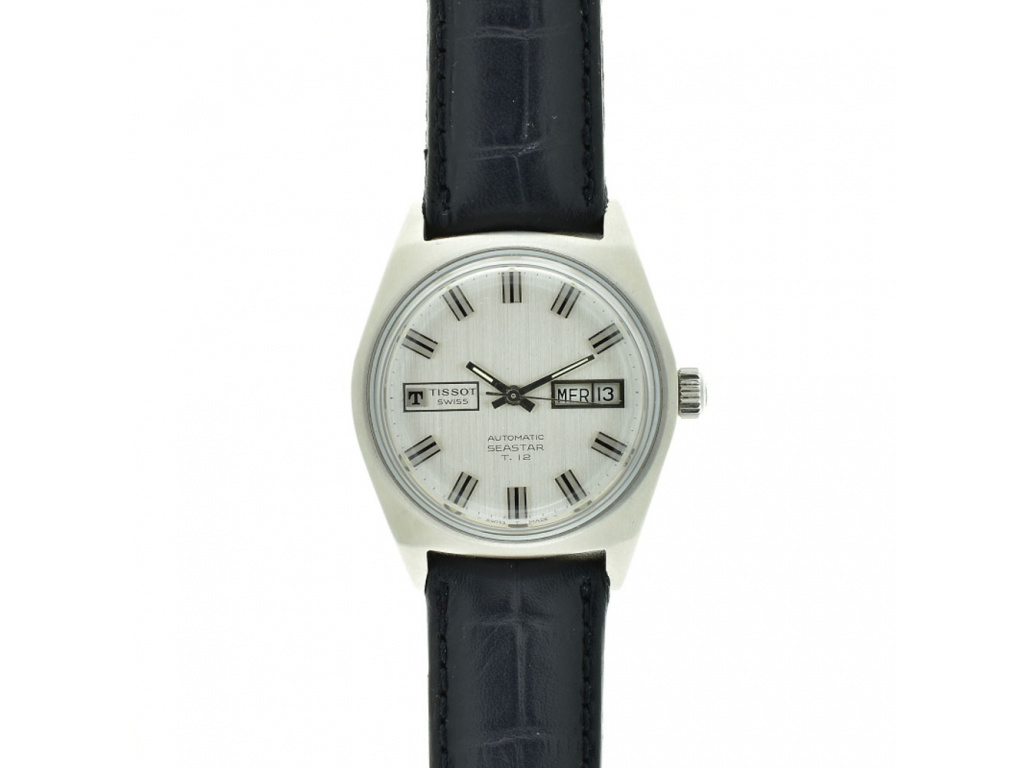 Kompletně renovované starožitné hodinky Tissot Automatic Seastar T.12 z let 1970-1975. Hodinky mají renovované pouzdro, nové sklíčko a nový kožený řemínek. Mechanický strojek Tissot kalibru 794 prošel kompletním servisem a seřízením.